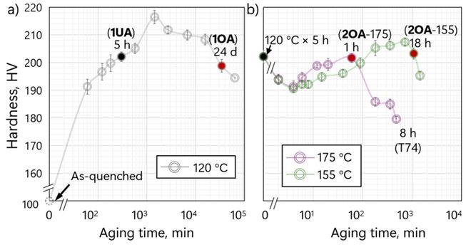 图1. (a)单步时效和(b)两步时效工艺的时效硬化响应。1UA:单步欠时效;1OA:单步过时效;2OA:两步过时效。注:所有强度低于T6处理的两步时效材料均定义为过时效。