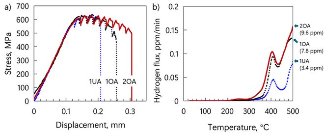 基于上述进展,研究团队通过设计热处理与力学对照实验,精确揭示了晶内T相对改善氢脆的关键作用。设计了单步低温峰值时效、单步低温过时效以及两种温度下的两步过时效(图1),在强度差异不超过5%的条件下,系统比较了各工艺的抗氢脆性能(图2)。结果表明,两步过时效合金能显著抑制氢致开裂,而传统观点仅从时效效率与析出相粗化角度无法完全解释1OA与2OA在抗氢脆性能上的差异。